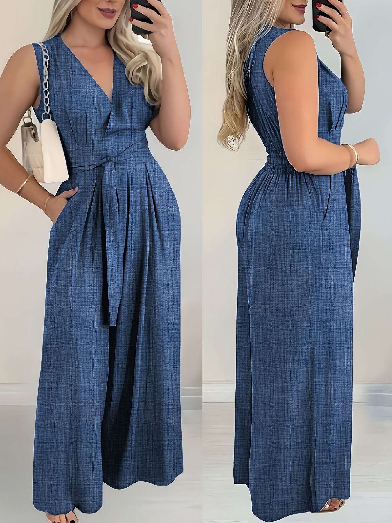 بدلة نسائية أنيقة بلون صلب مع رقبة متقاطعة وخصر عريض بدون خصر مع تفاصيل مطوية، مثالية للبالغين، الصيف، الأسلوب الأنيق، بدلة صلبة اللون