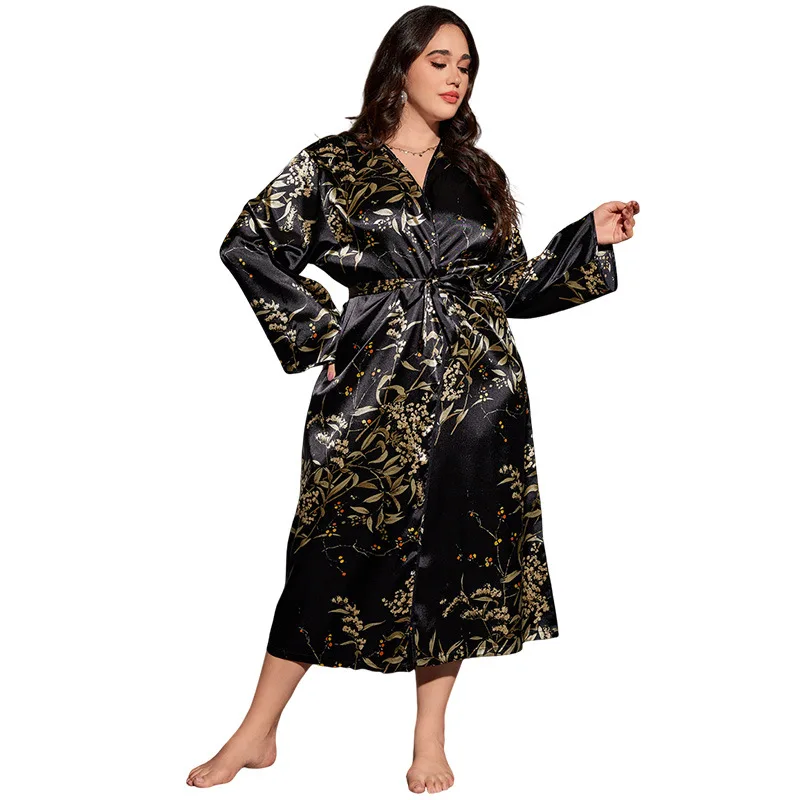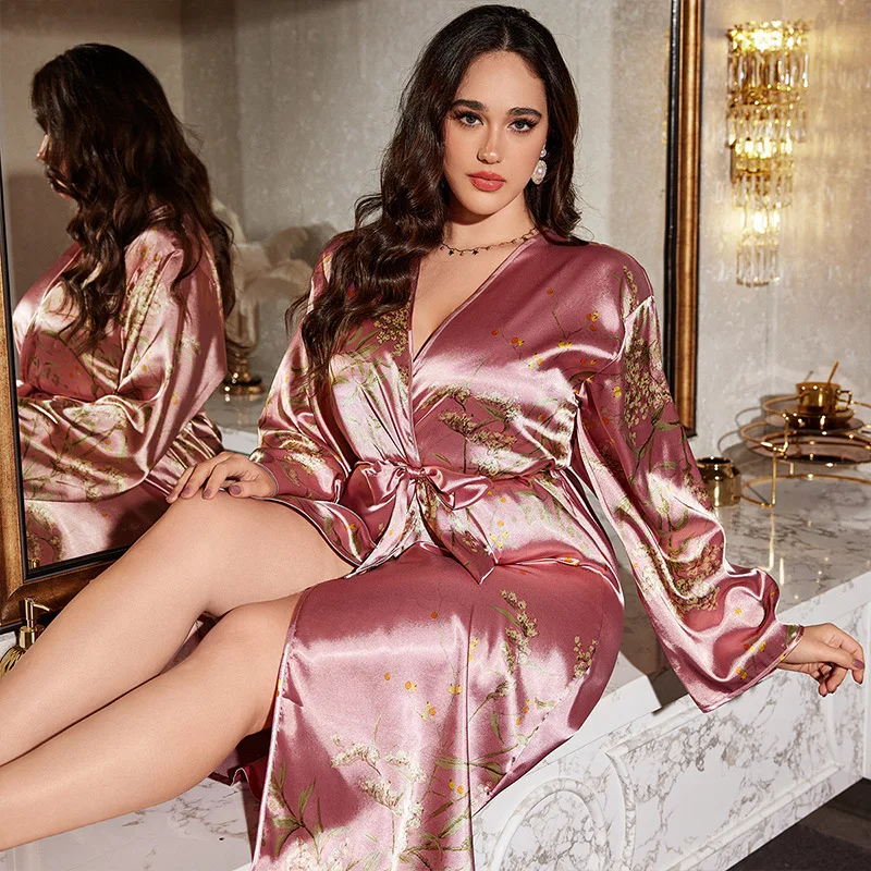 كبير الحجم المرأة ليلة رداء الخامس الرقبة مثير حبل من الحرير مع حزام قصير الساتان كيمونو رداء ملابس خاصة البشكير روب للنوم
