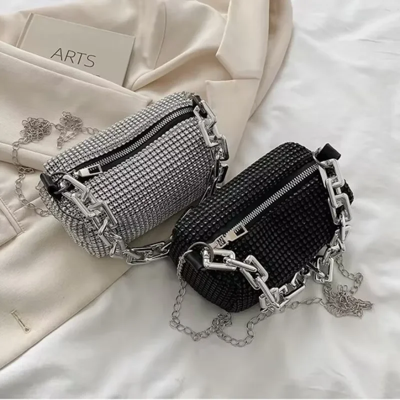 النسخة الكاملة من حقيبة دلو من حجر الراين، حقيبة كتف أنيقة على شكل سلسلة كروية متألقة، حقيبة كروس صغيرة محمولة باليد للنساء