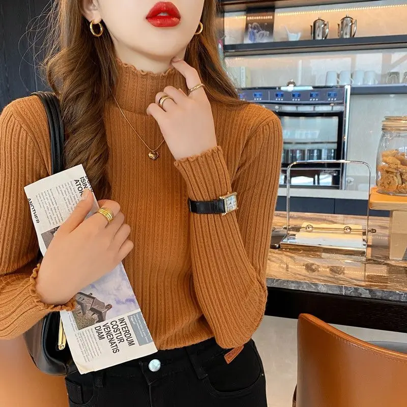 بلوفرات متماسكة أنيقة مكشكشة للخريف والشتاء سترة أنيقة ضيقة بأكمام طويلة وياقة مدورة بلوفر حلو ملابس نسائية