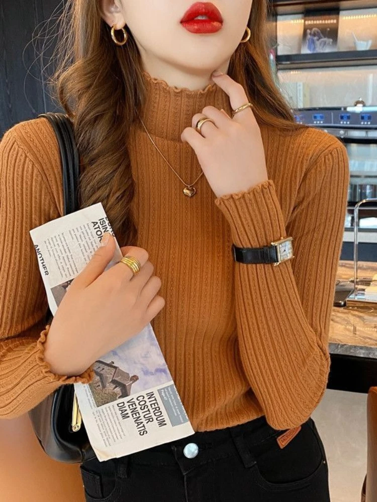 بلوفرات متماسكة أنيقة مكشكشة للخريف والشتاء سترة أنيقة ضيقة بأكمام طويلة وياقة مدورة بلوفر حلو ملابس نسائية