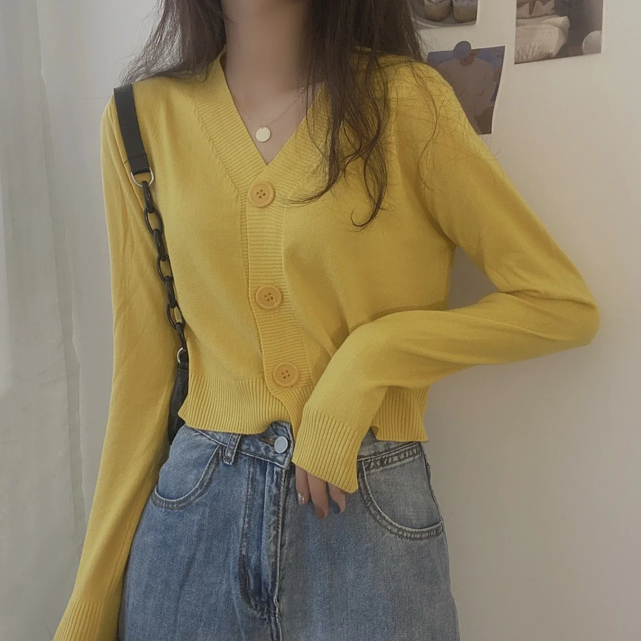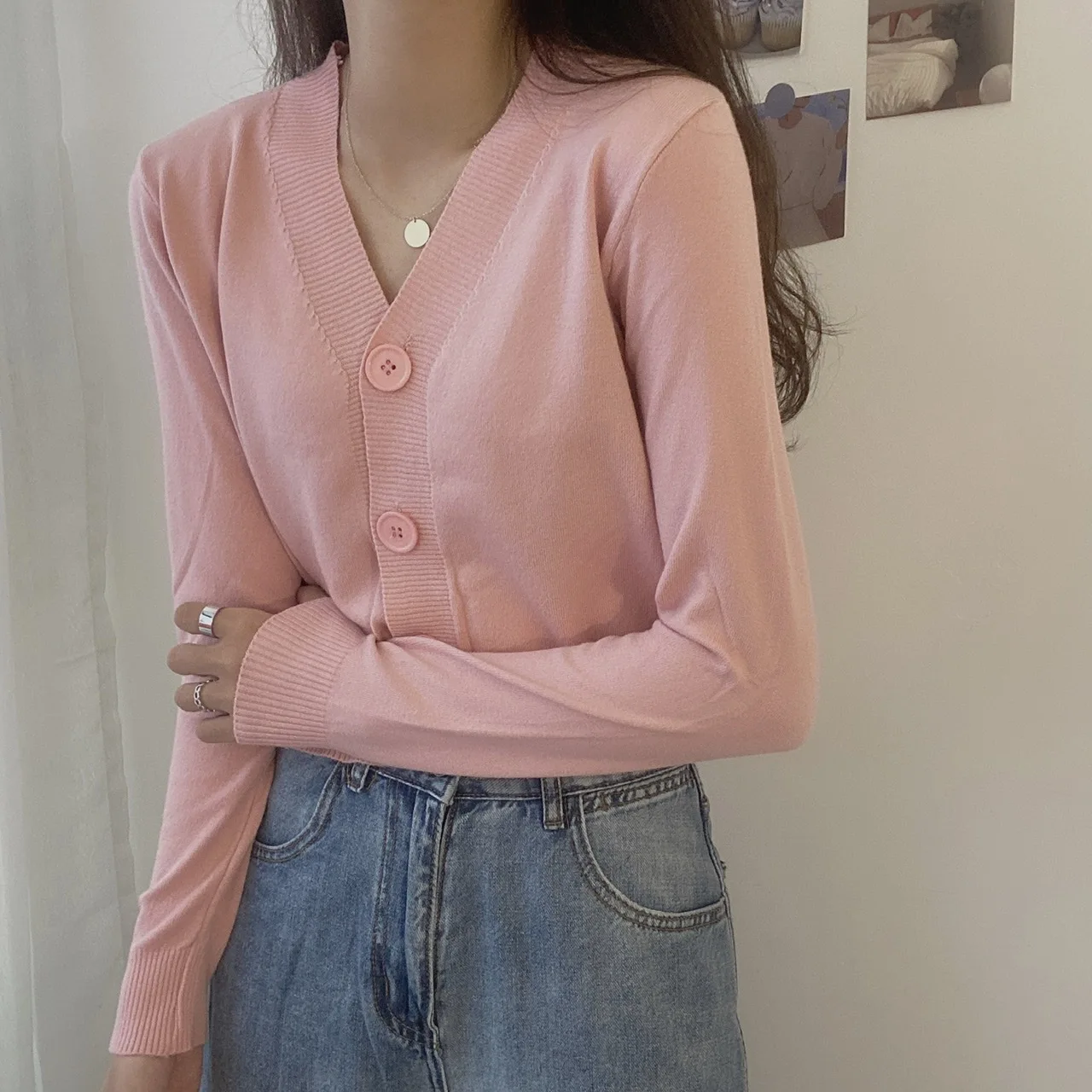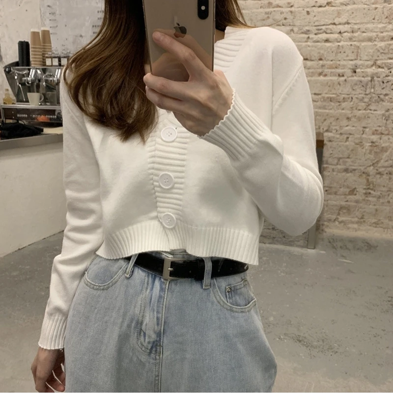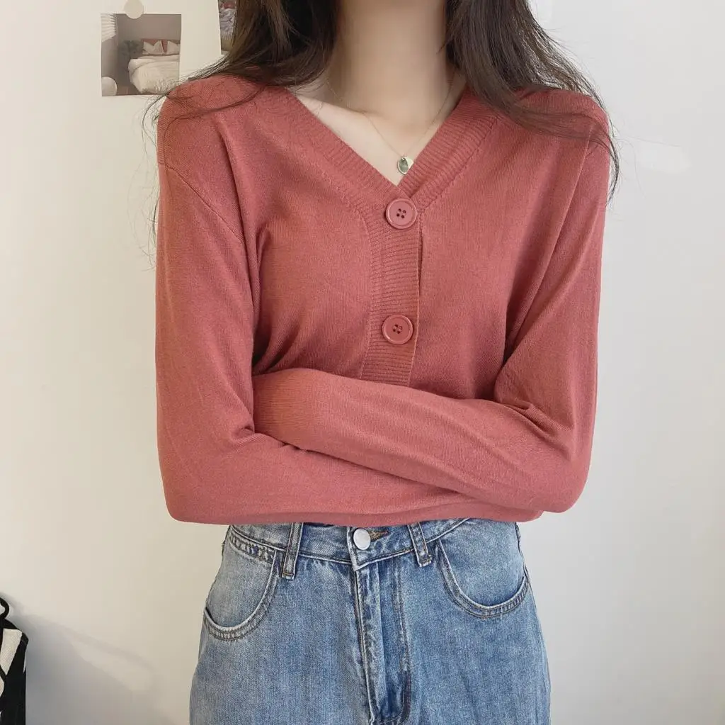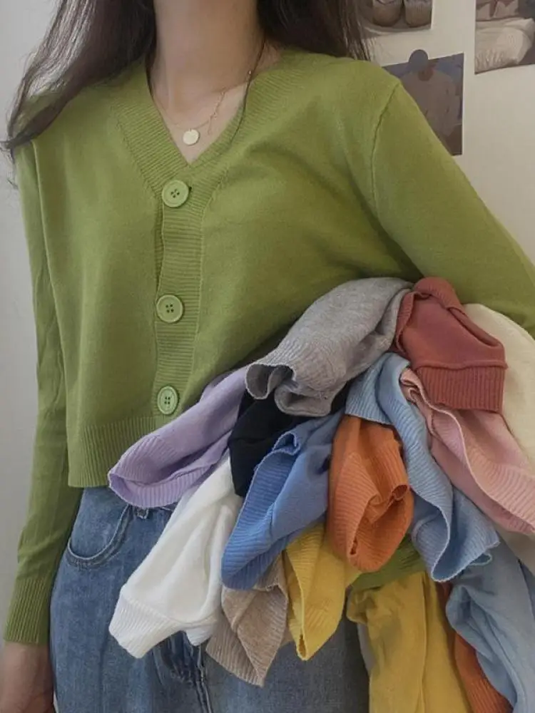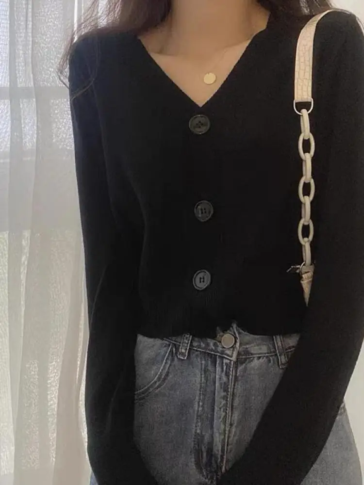 بلوفر نسائي بأزرار وأكمام طويلة ورقبة v ، كارديجان محبوك ، بلوزة قصيرة ، ملابس نسائية ، ملابس شارع ضيقة ، أحادية اللون ، خريف ، شتاء