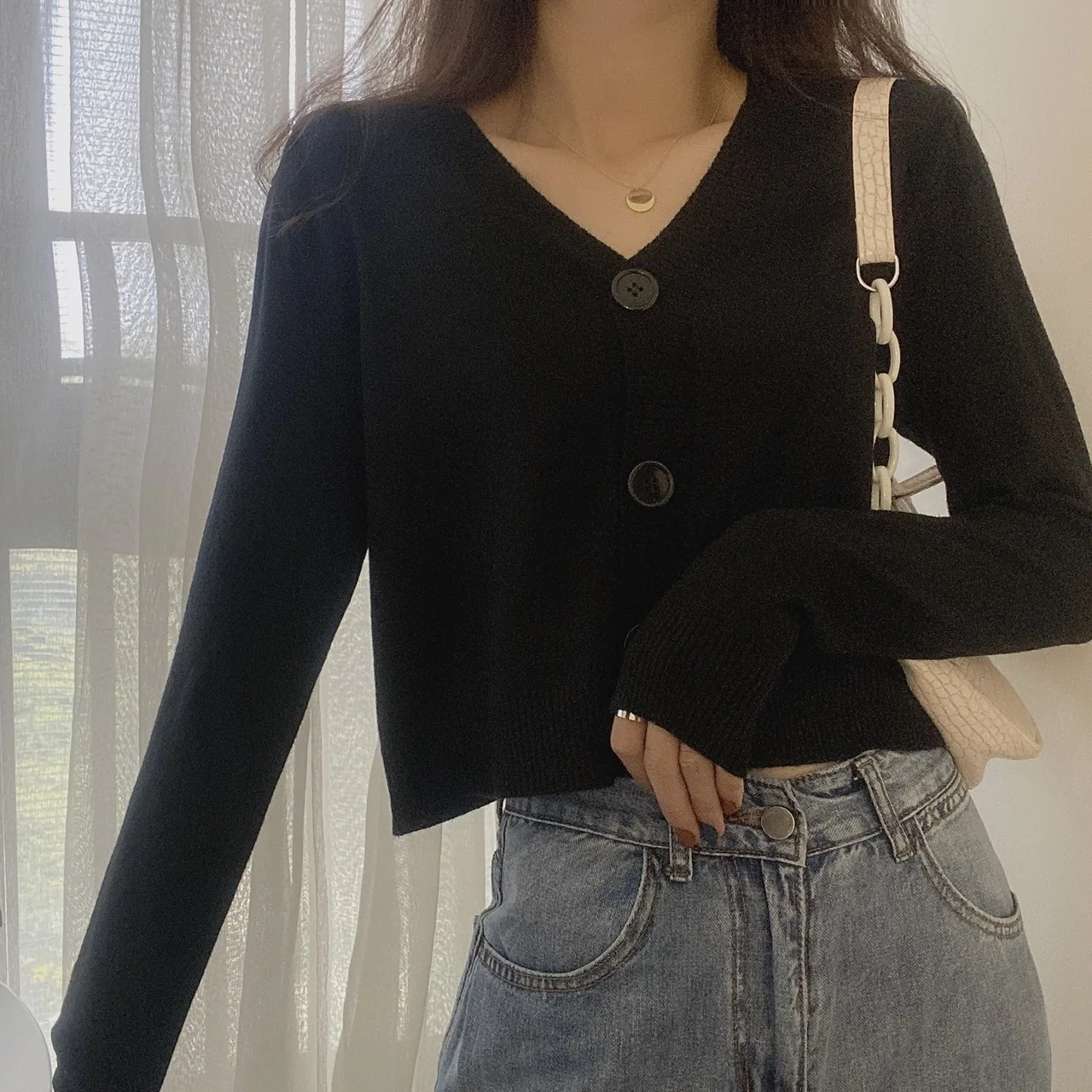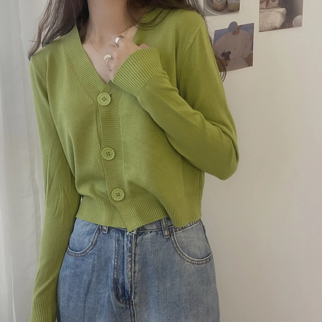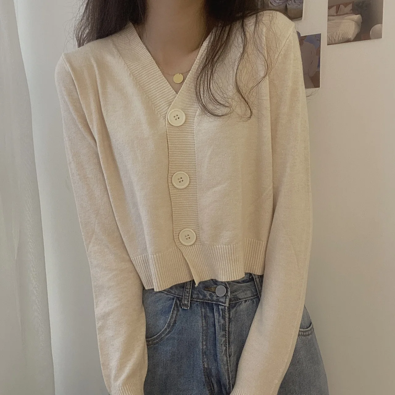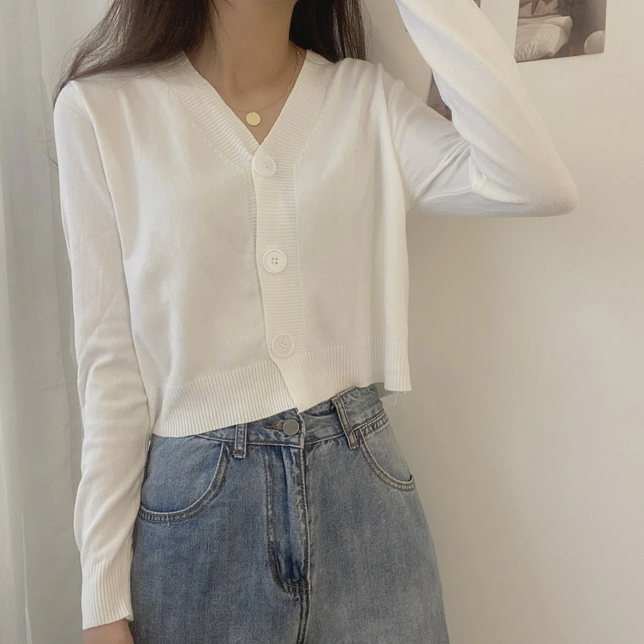 بلوفر نسائي بأزرار وأكمام طويلة ورقبة v ، كارديجان محبوك ، بلوزة قصيرة ، ملابس نسائية ، ملابس شارع ضيقة ، أحادية اللون ، خريف ، شتاء