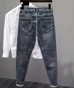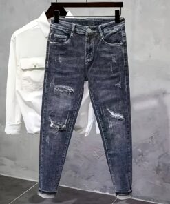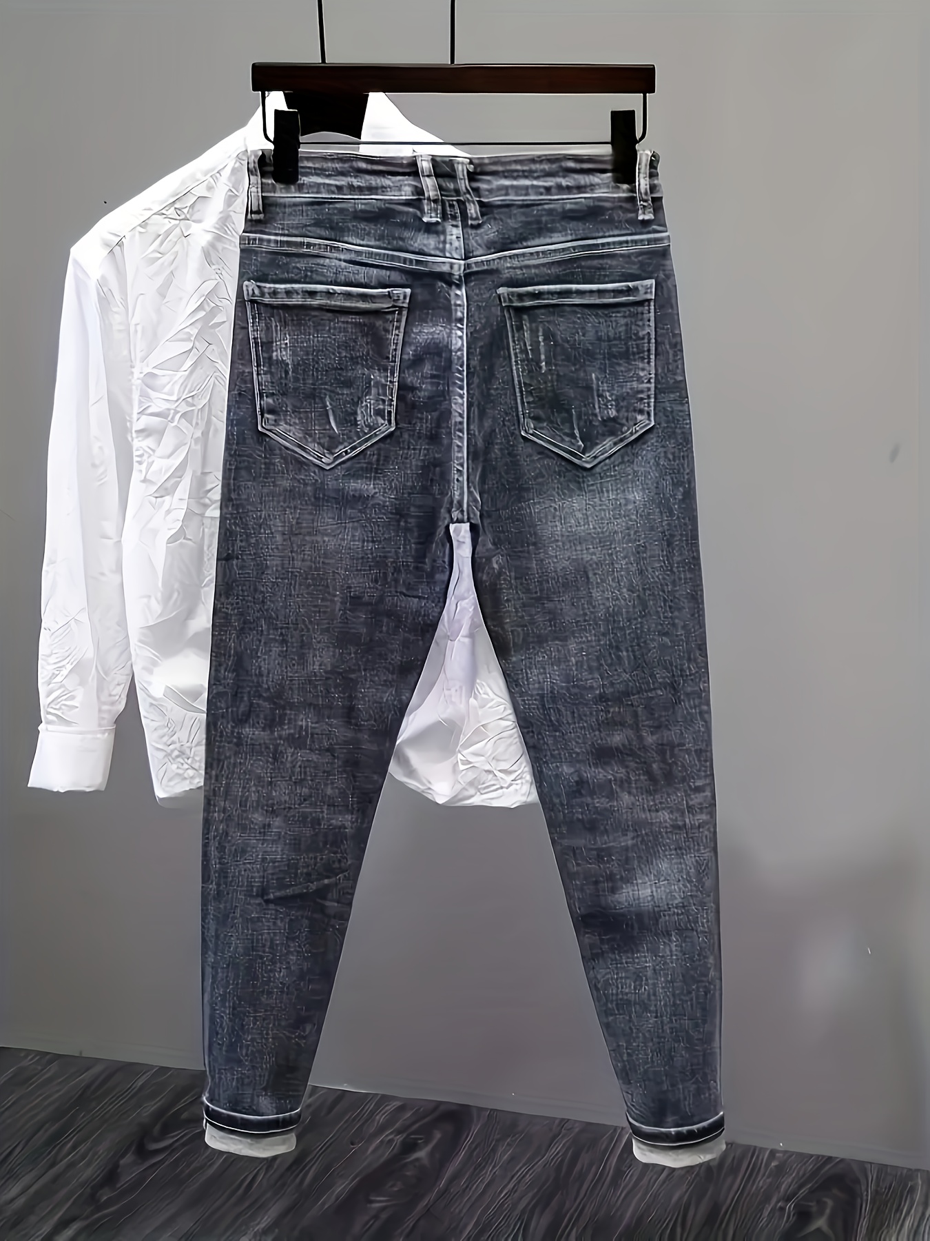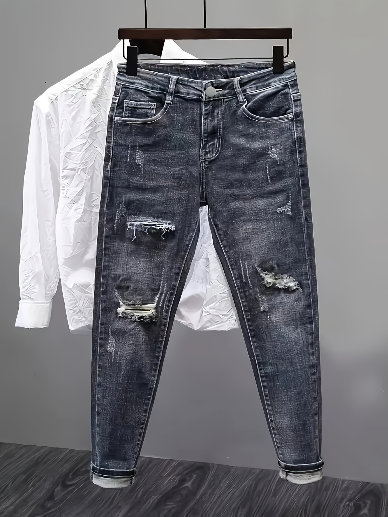 بنطلون جينز رجالي ثقيل الوزن مغسول بقصة ضيقة ممزق باللون الأزرق الرمادي – جينز أزرق قديم الغسيل، أرجل مدببة مرنة، مناسب لجميع الفصول للارتداء الكاجوال والرسمي، بنطلون شارع قابل للغسيل في الغسالة