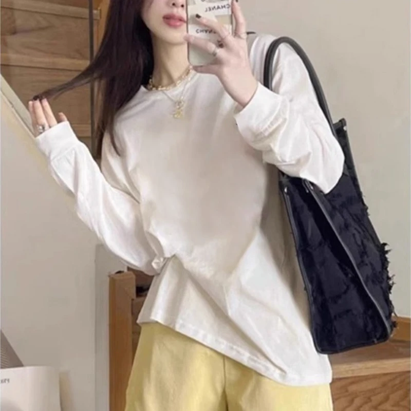 تي شيرت نسائي فضفاض بأكمام طويلة للخريف والشتاء كاجوال بياقة دائرية من القطن الخالص بلوفرات بسيطة متعددة الاستخدامات بطبقة أساسية