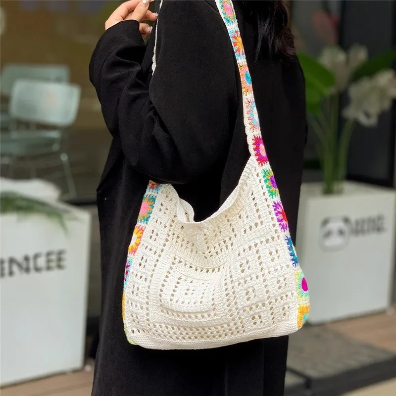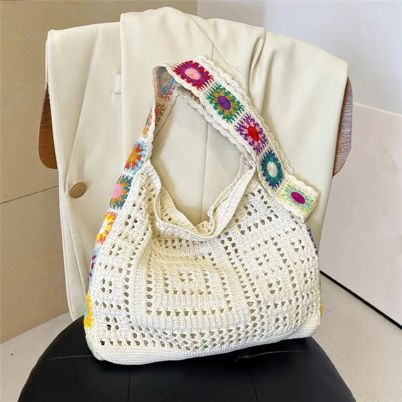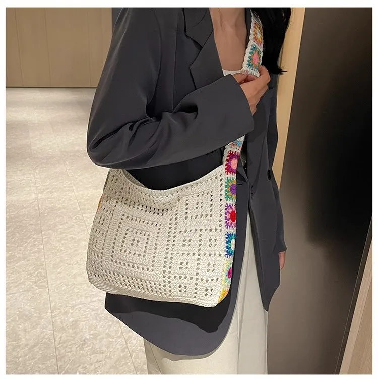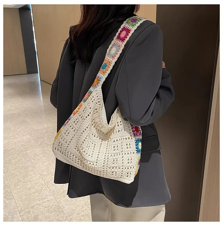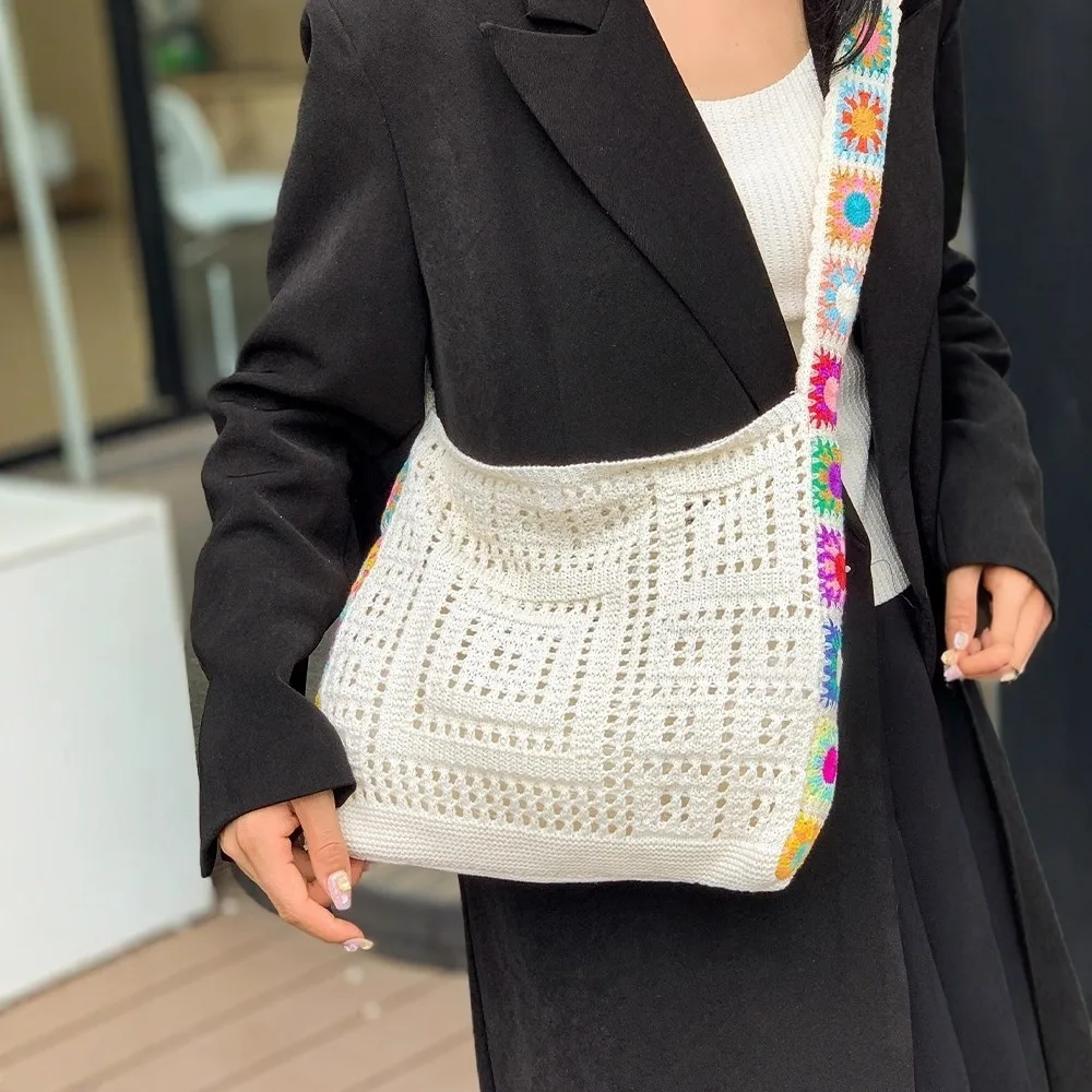 حقيبة كروس عصرية مجوفة منقوشة بالزهور، حقيبة كتف كروشيه أنيقة، حزام كتف على شكل زهور عشوائي