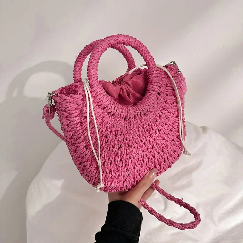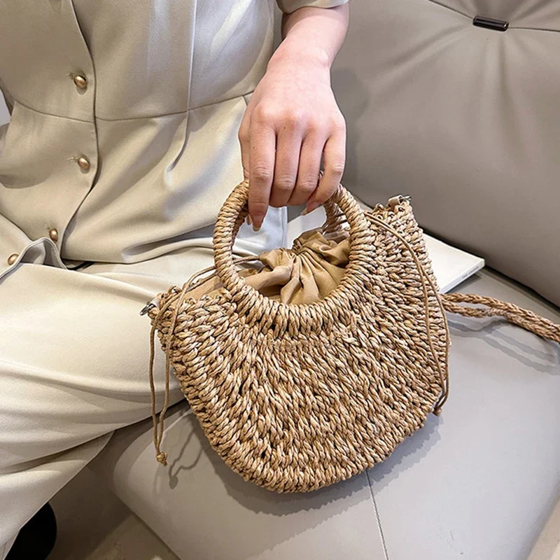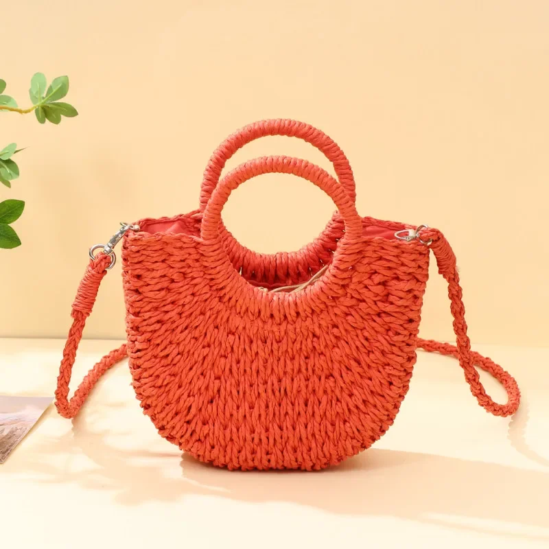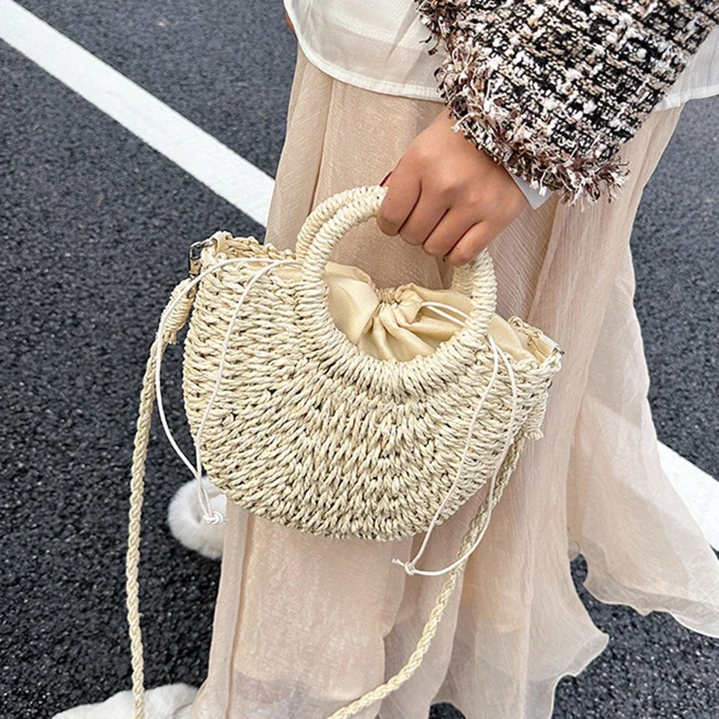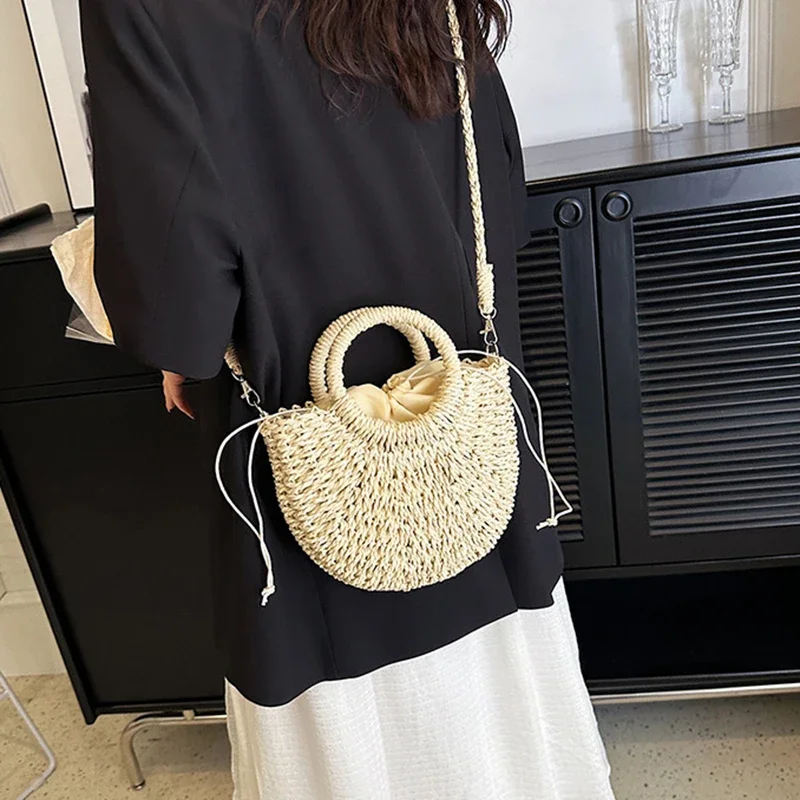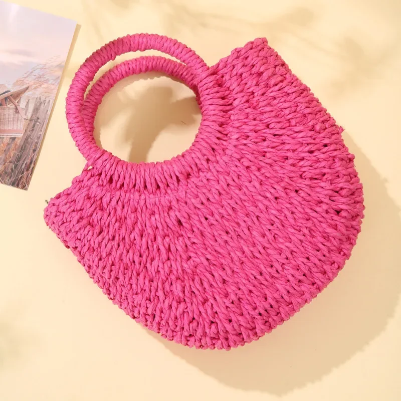 حقيبة يد شاطئ منسوجة يدويًا من القش الروطان نصف قمر، حقيبة كروس نسائية صيفية ذات سعة كبيرة، حقيبة يد منسوجة