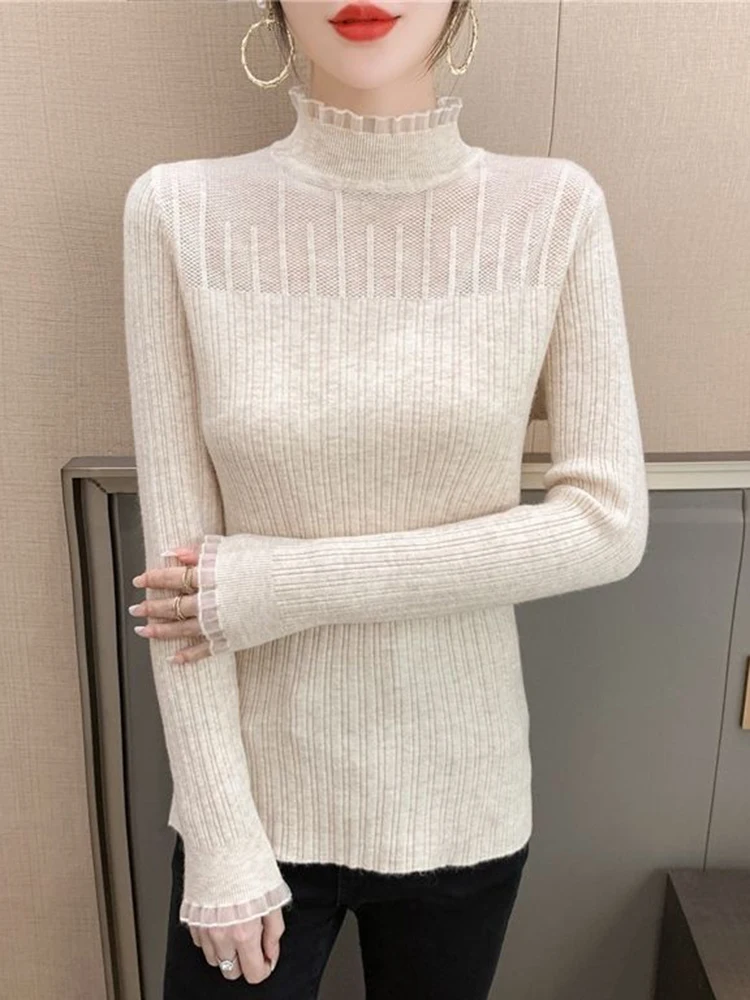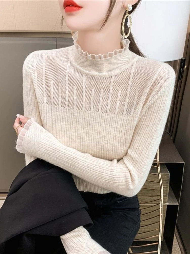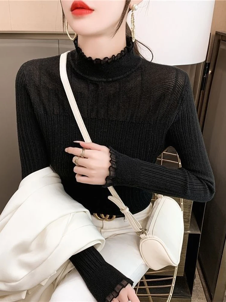سترة برقبة وهمية من الدانتيل للنساء ، ملابس تريك مثيرة من خلال النظر ، بلوفرات أحادية اللون ، سترة ناعمة بأكمام طويلة ، قمة نسائية ، الخريف والشتاء