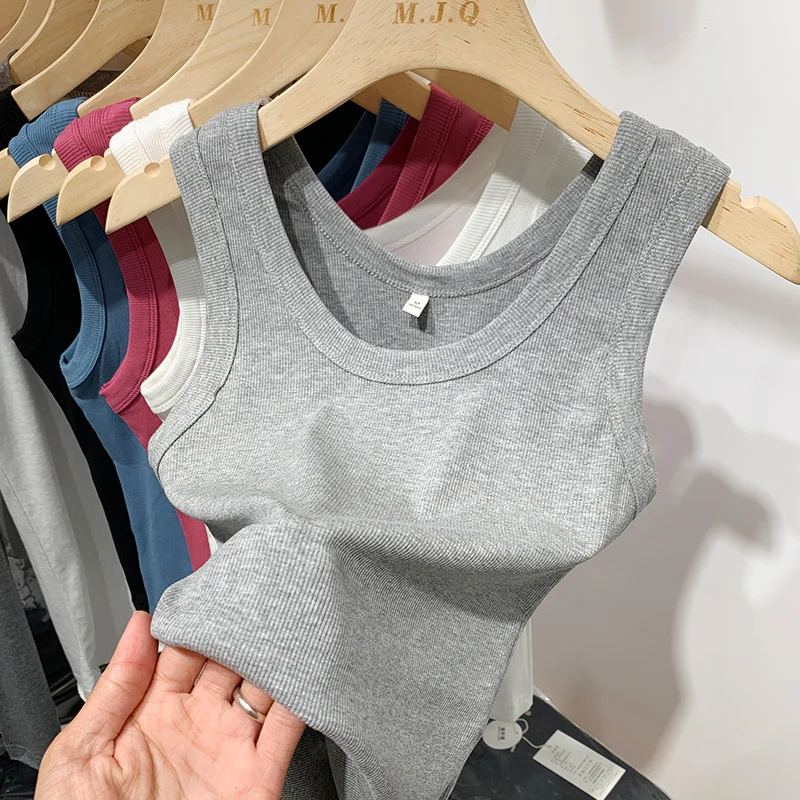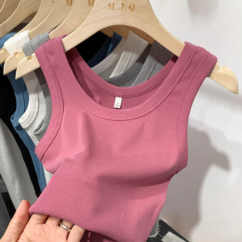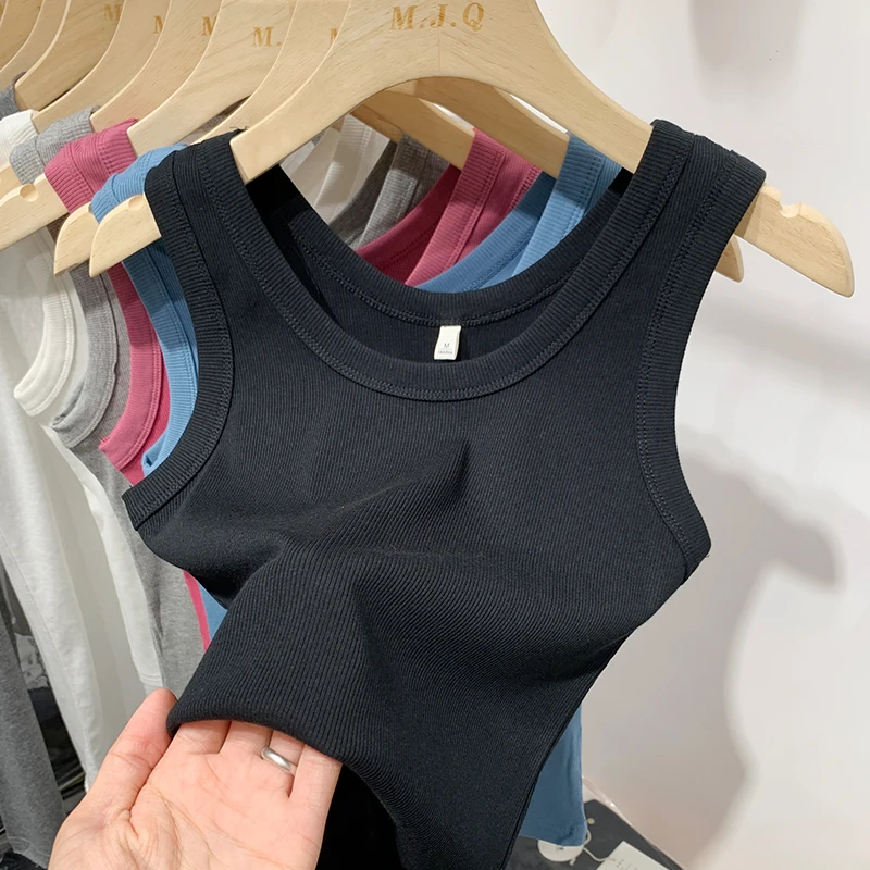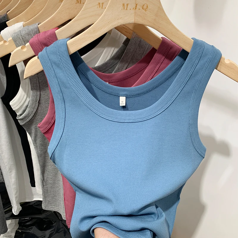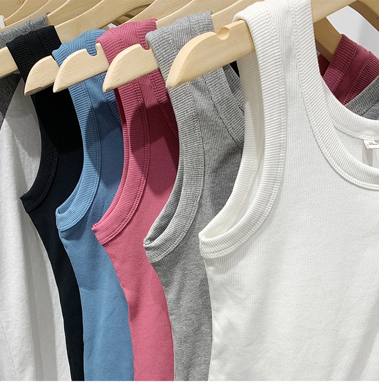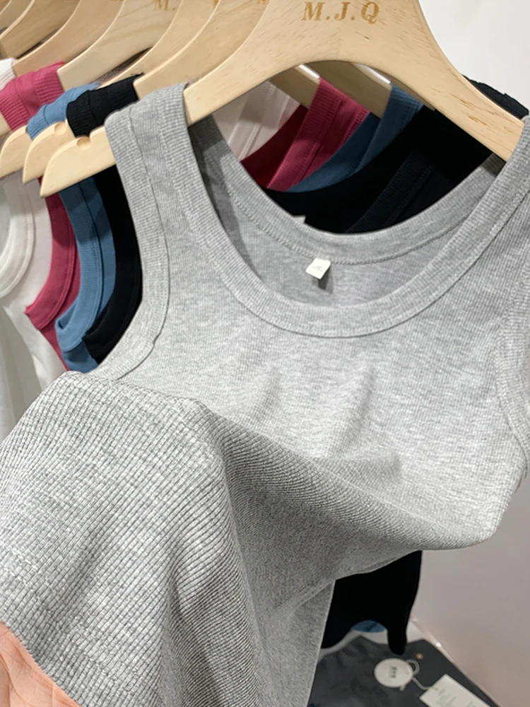 سترة نسائية مضلعة محبوكة ، توبات بدون أكمام ، توب قصير ، رقبة دائرية ، كاميس أحادي اللون ، ملابس شارع قصيرة ، موضة لياقة بدنية ، صيف
