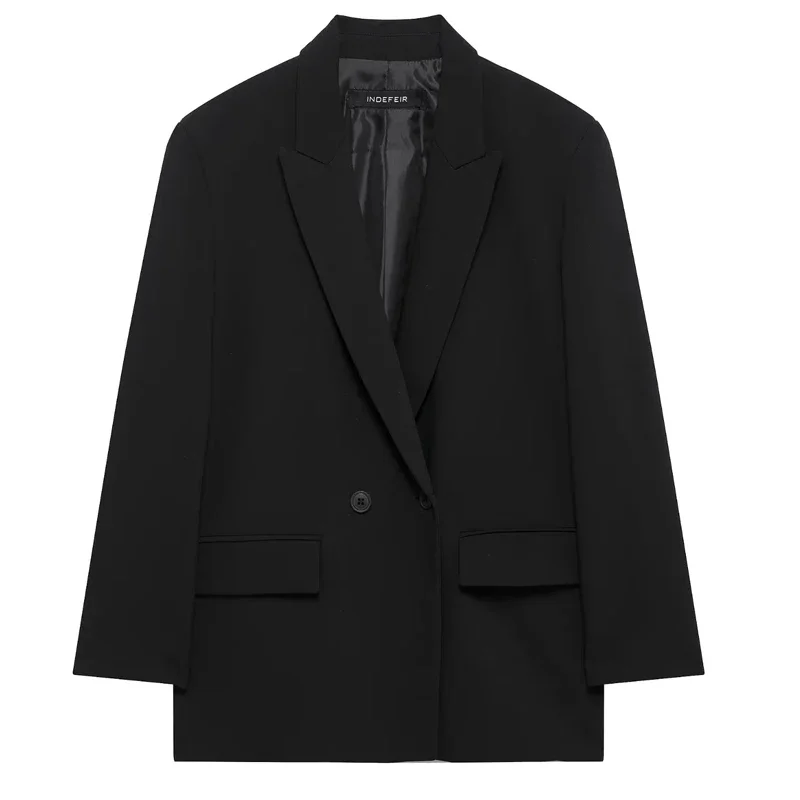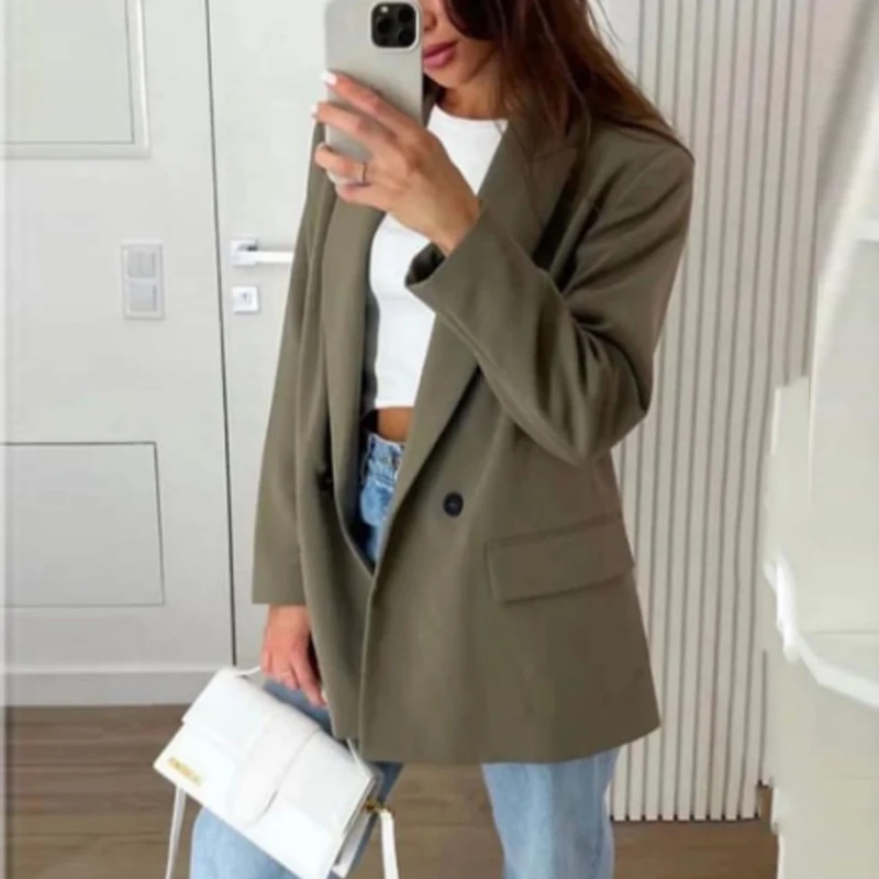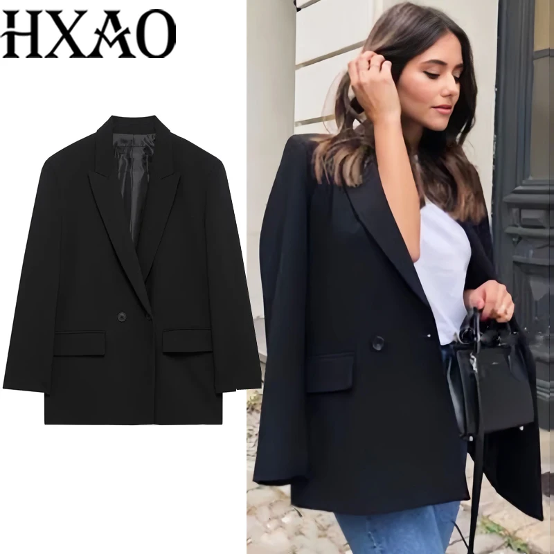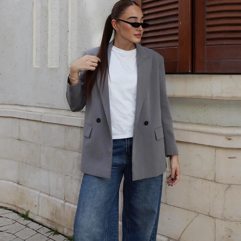 سترة نسائية من HXAO ملابس مكتبية سترة سوداء للأعمال سترة طويلة فضفاضة غير رسمية مزدوجة الصدر سترة رمادية