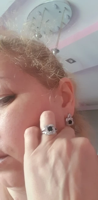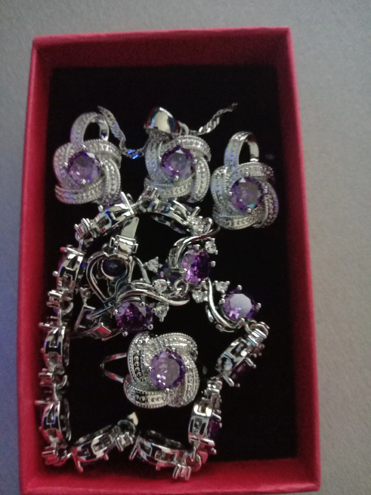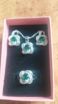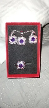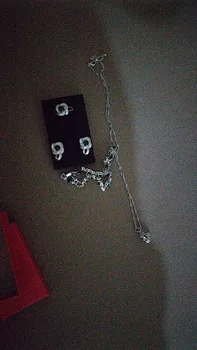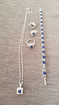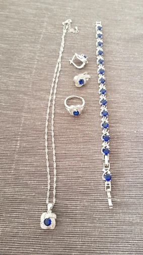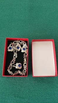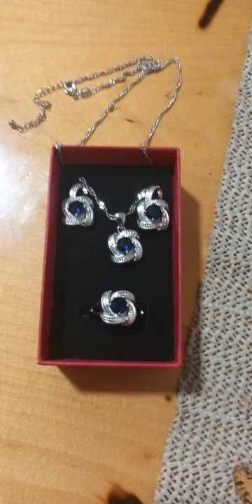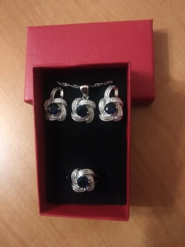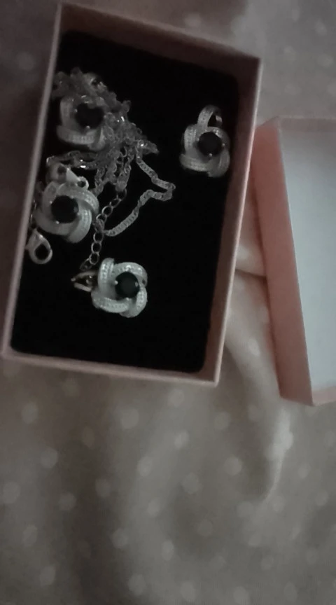 as in the pictures. I ordered the set as a gift for a friend for her 30th BDay and it is just perfect! fast delivery (a month earlier than expected). packaged well. and thebsetbitselfnis just beautiful. every piece is solid and of a very good quality. I also love the chain. the way it is done makes it sparkle. I will order one for myself. thank you so much!