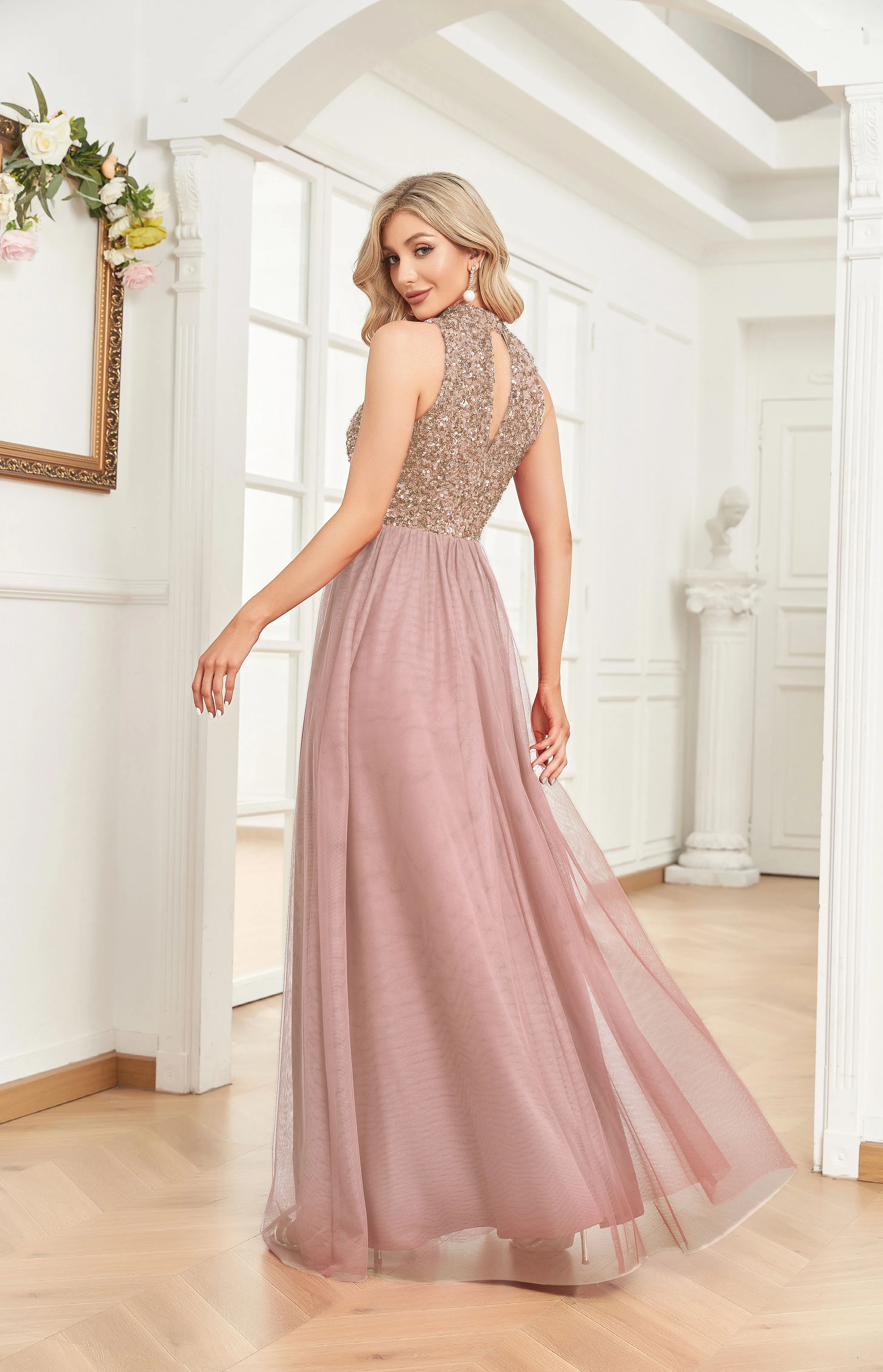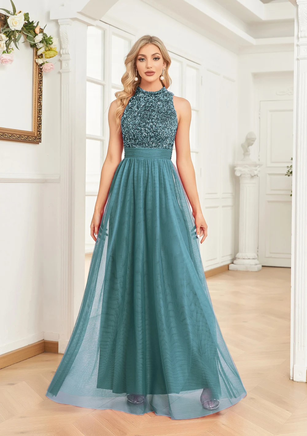 فساتين سهرة أنيقة برقبة على شكل حرف V ترتر أخضر طويل فاخر للنساء من التل بدون أكمام لحفلات الزفاف وحفلات الكوكتيل