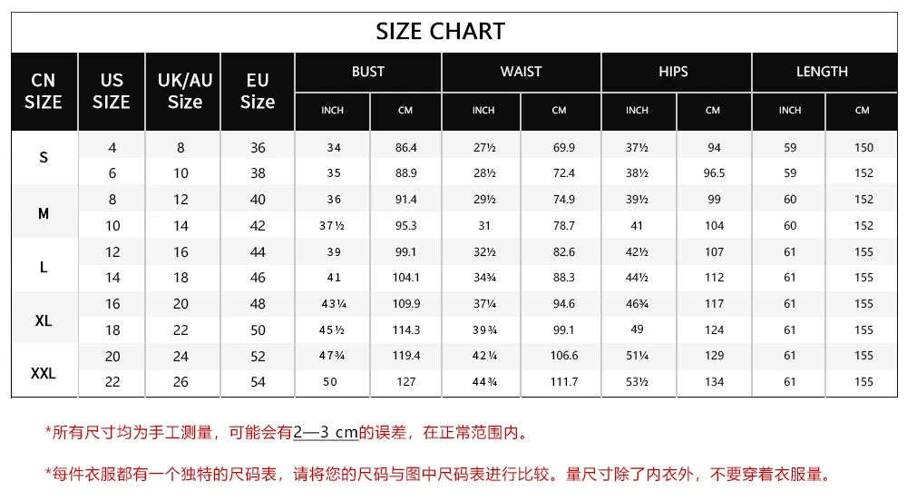size_info | {"sizeInfoList":[{"length":{"cm":"84", "inch":"33.07"}, "size":"4", "vid":-1}, {"length":{"cm":"88", "inch":"34.65"}, "size":"6", "vid":-2}, {"length":{"cm":"92", "inch":"36.22"}, "size":"8", "vid":-3}, {"length":{"cm":"96", "inch":"37.80"}, "size":"10", "vid":-4}, {"length":{"cm":"100", "inch":"39.37"}, "size":"12", "vid":-5}, {"length":{"cm":"106", "inch":"41.73"}, "size":"14", "vid":-6}, {"length":{"cm":"112", "inch":"44.09"}, "size":"16", "vid":-7}]} |