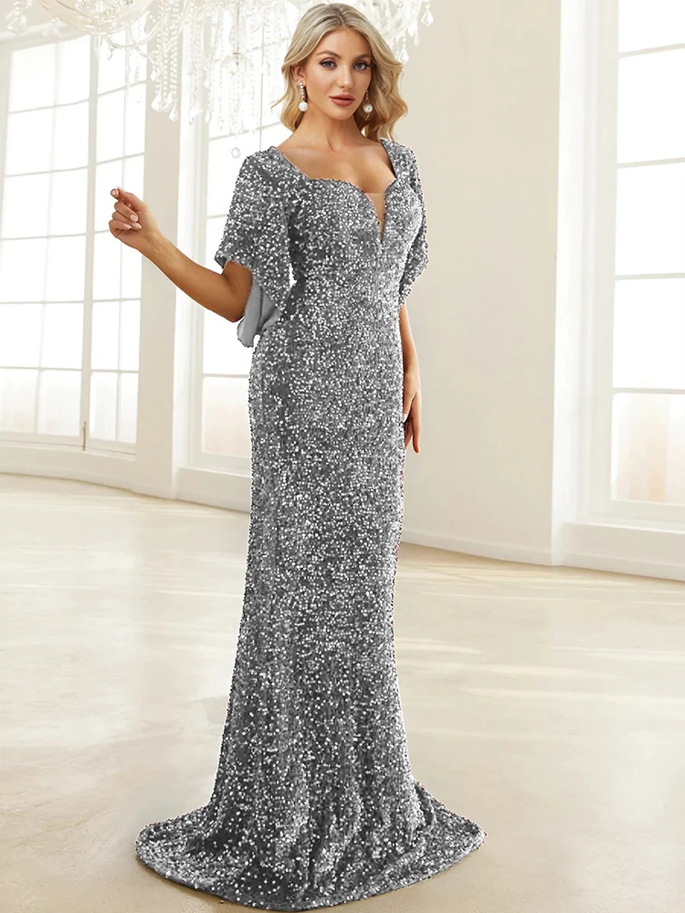 BABYONLINE فستان سهرة حورية البحر باللون الأسود بأكمام شفافة وخصر مطرز، فستان رسمي رومانسي للنساء