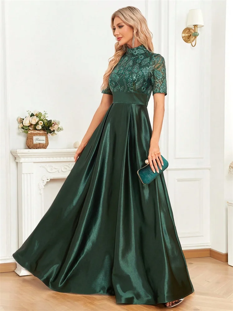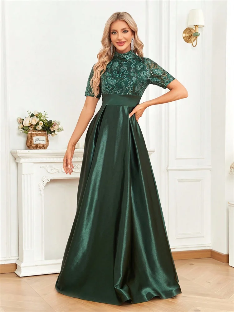 فستان سهرة رسمي أنيق بأكمام قصيرة للنساء 2024 برقبة دائرية من الساتان للحفلات الراقصة فستان أخضر بطول الأرض فساتين خضراء