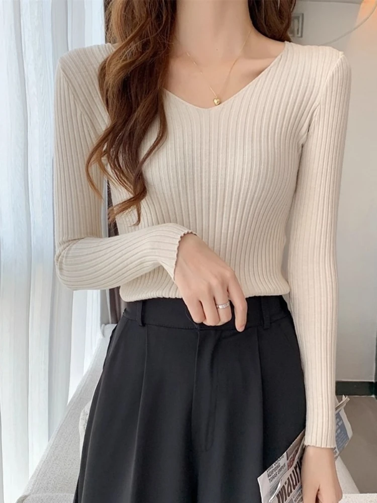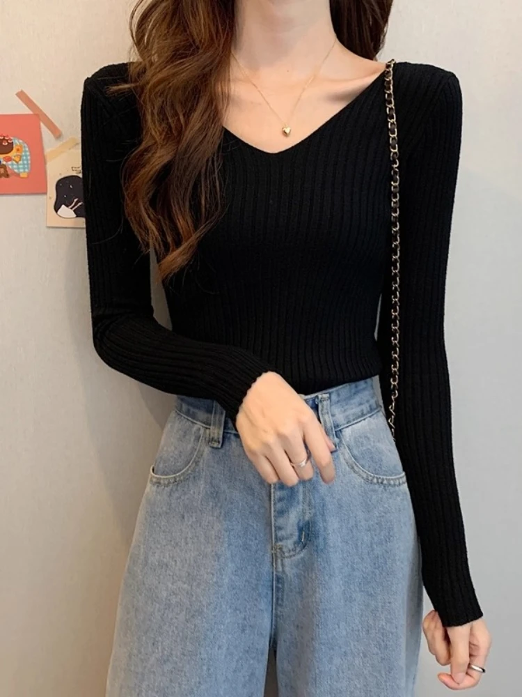 2025 بلون البلوفرات ضئيلة الكورية الخريف الشتاء الخامس الرقبة سترة موضة عادية كم طويل محبوك البلوزات ملابس حريمي