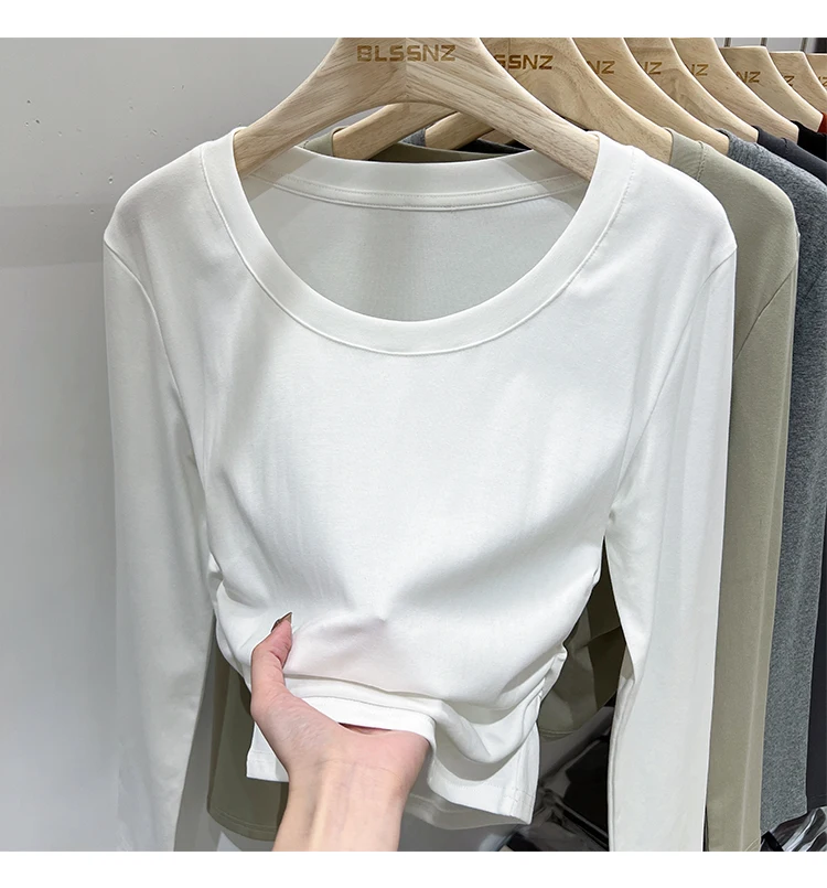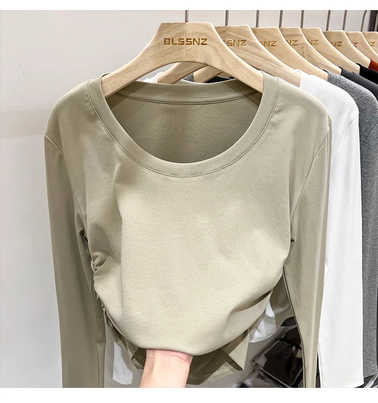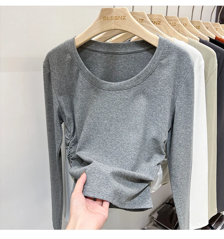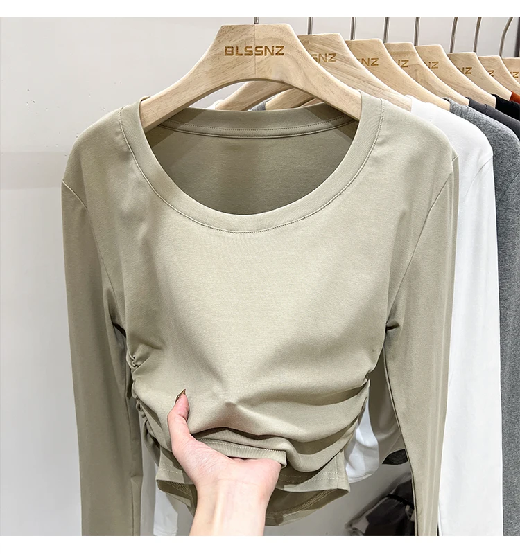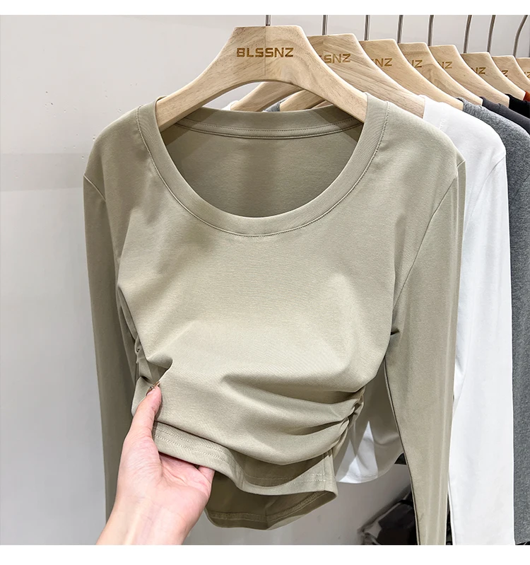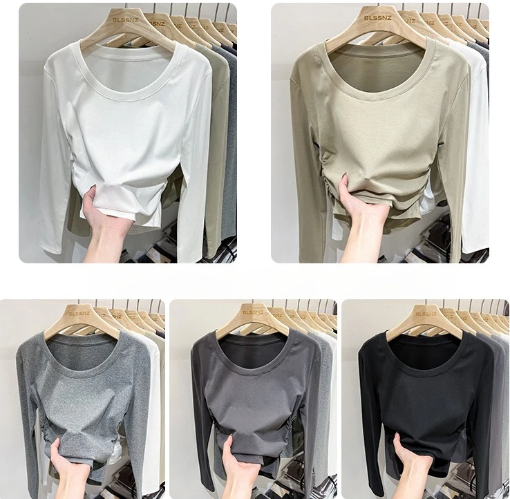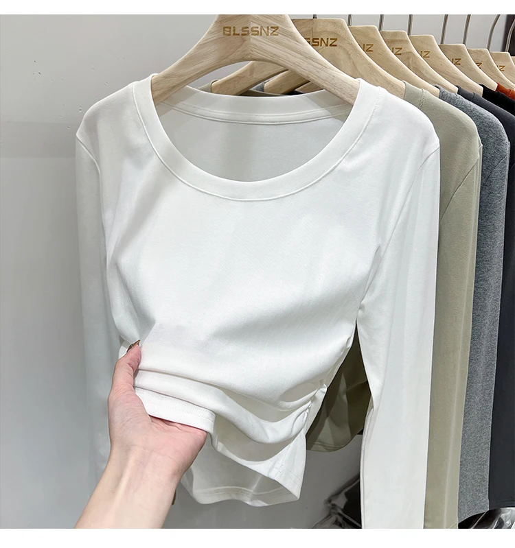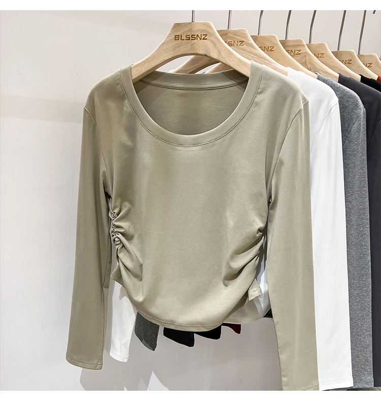2025 سليم تيشيرت ضيق بأكمام طويلة س الرقبة المرأة تي شيرت الخريف الجانب الطيات الصلبة تنوعا تي شيرت الكورية نمط بسيط قاعدة طبقة القمم