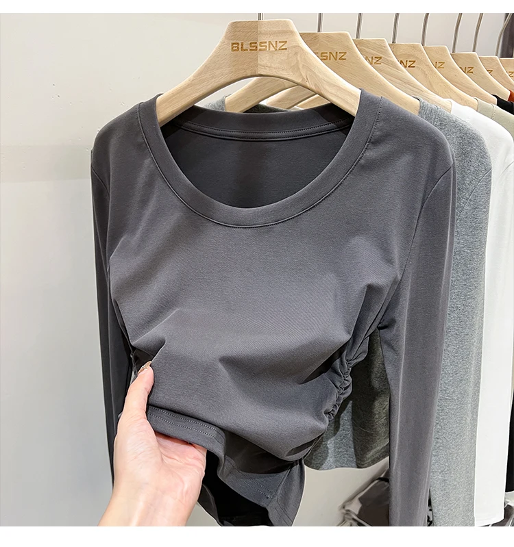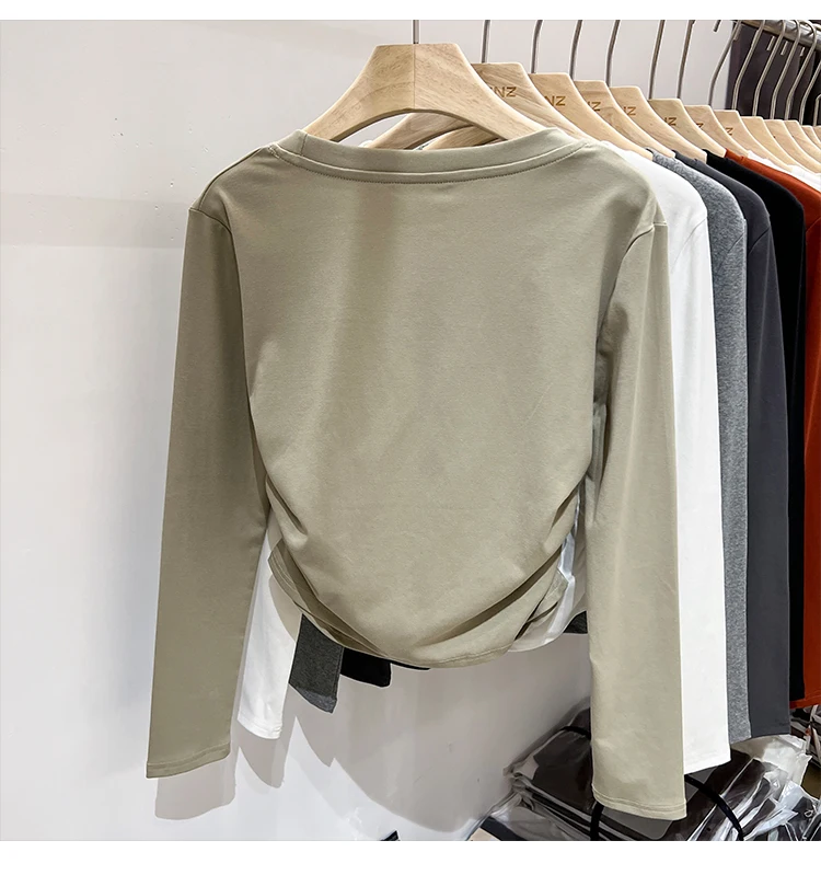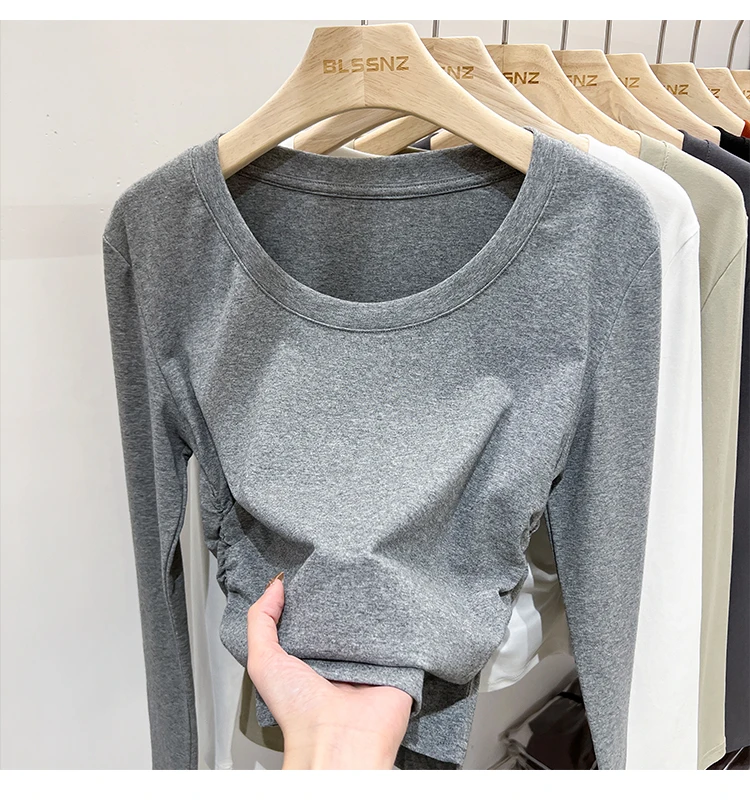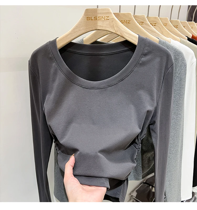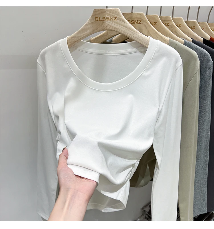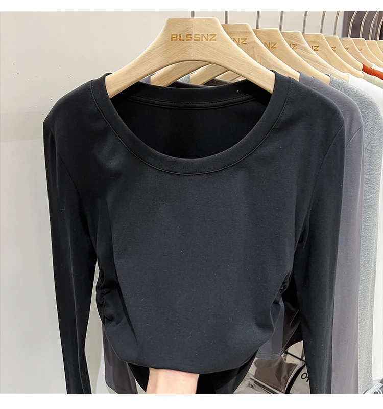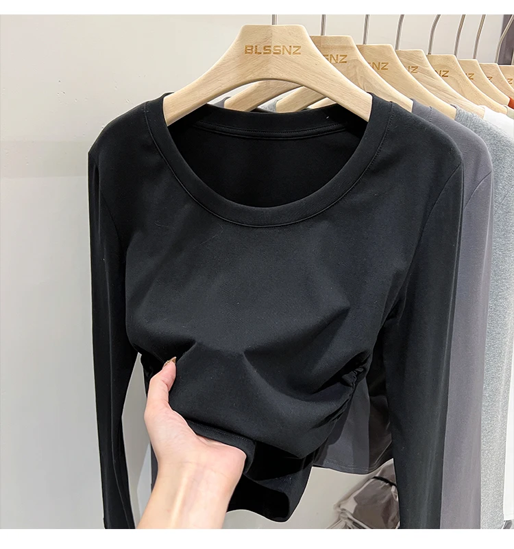 2025 سليم تيشيرت ضيق بأكمام طويلة س الرقبة المرأة تي شيرت الخريف الجانب الطيات الصلبة تنوعا تي شيرت الكورية نمط بسيط قاعدة طبقة القمم