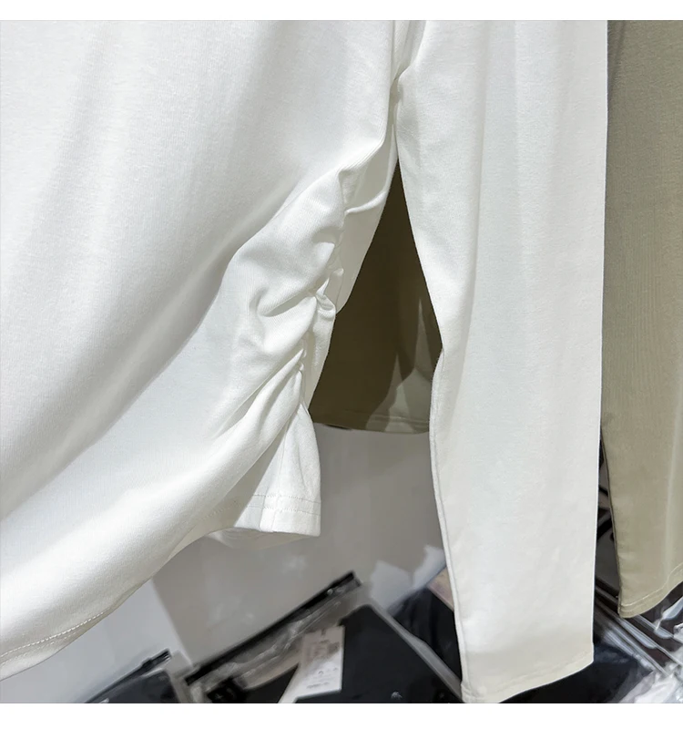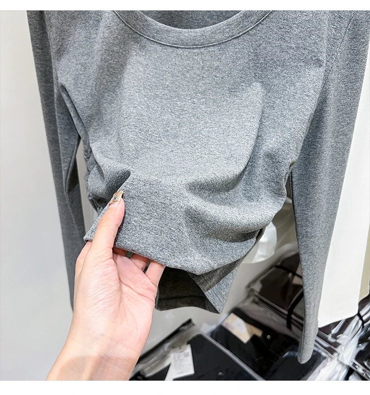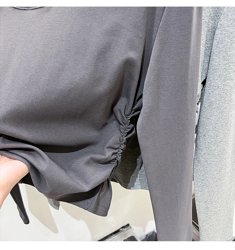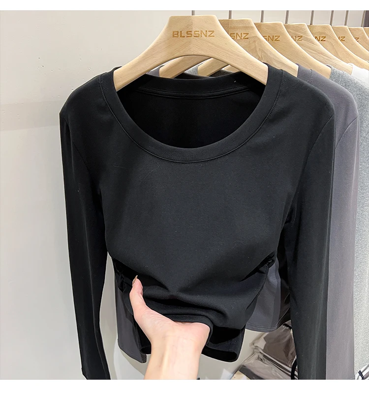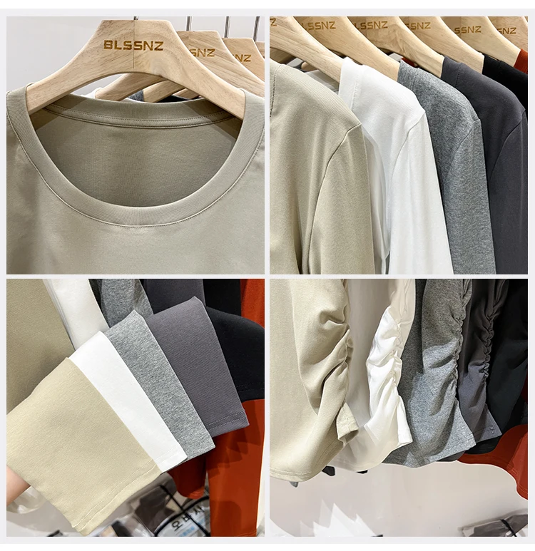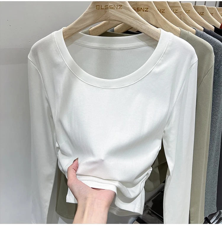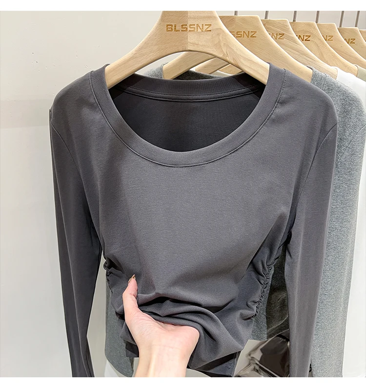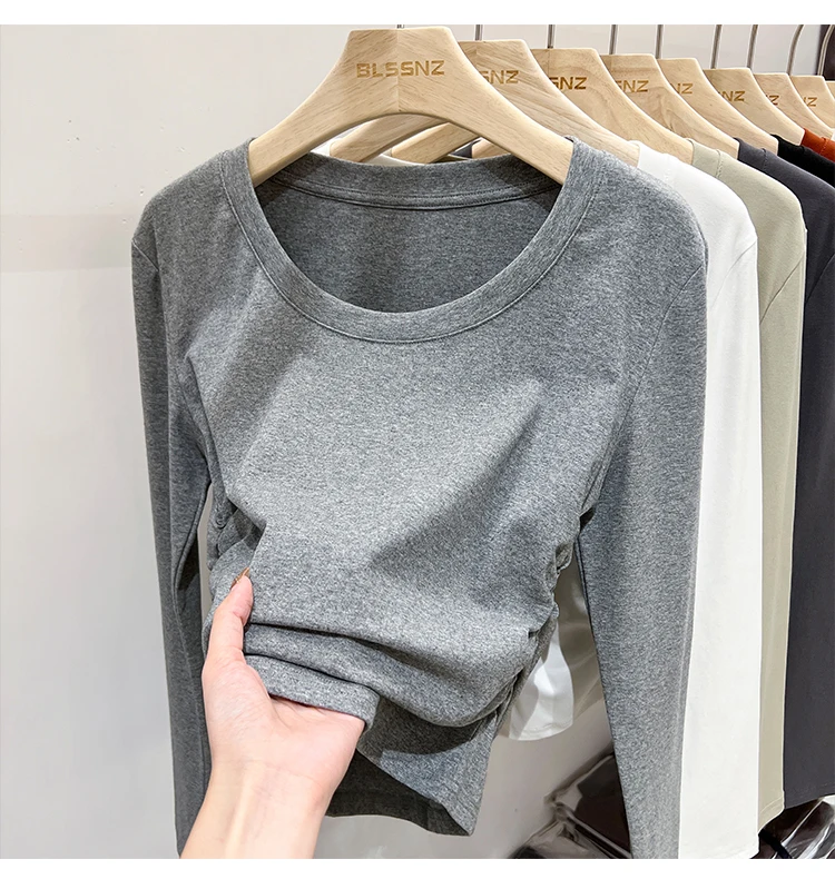 2025 سليم تيشيرت ضيق بأكمام طويلة س الرقبة المرأة تي شيرت الخريف الجانب الطيات الصلبة تنوعا تي شيرت الكورية نمط بسيط قاعدة طبقة القمم