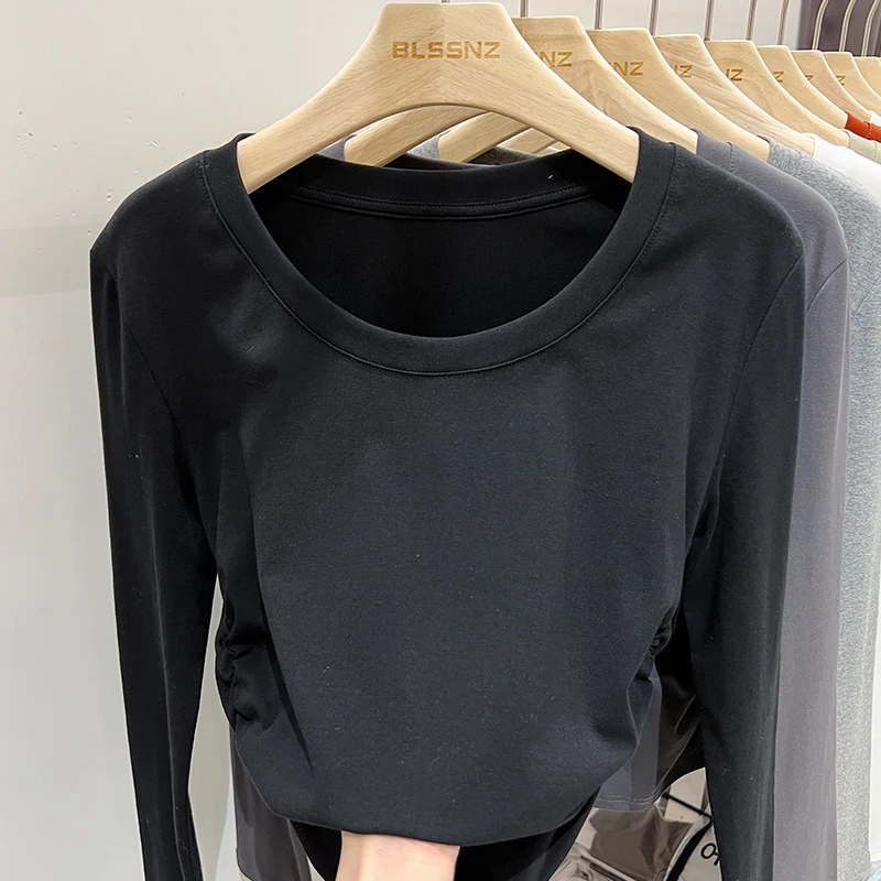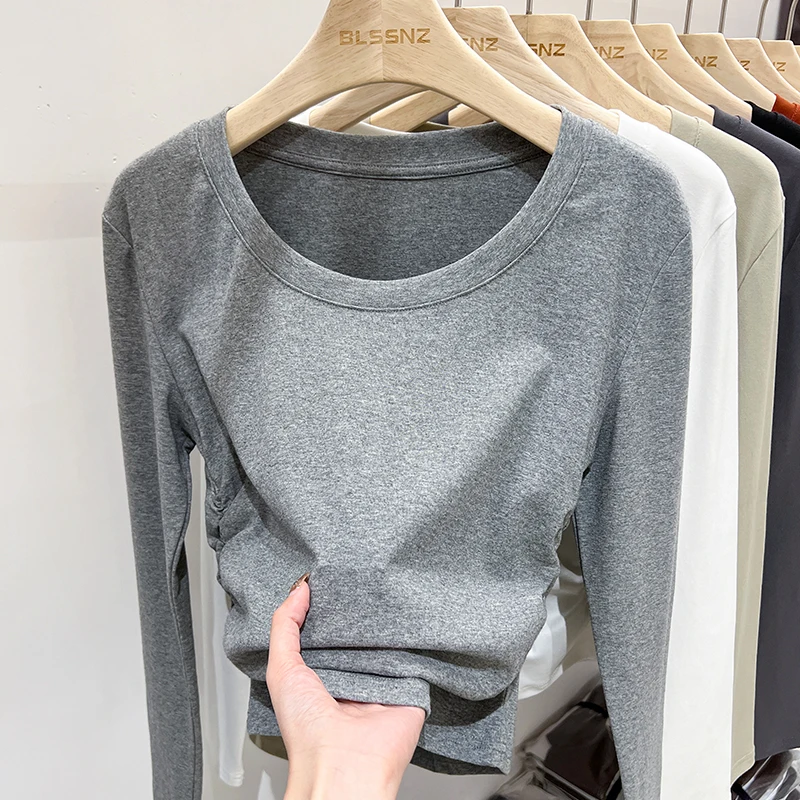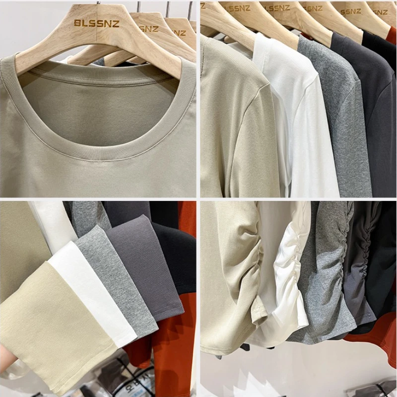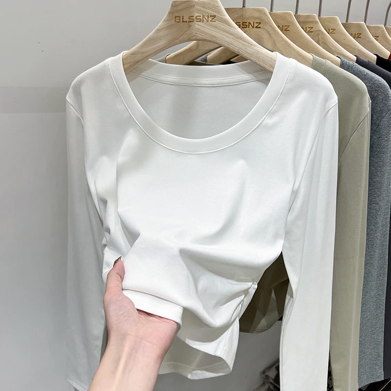 2025 سليم تيشيرت ضيق بأكمام طويلة س الرقبة المرأة تي شيرت الخريف الجانب الطيات الصلبة تنوعا تي شيرت الكورية نمط بسيط قاعدة طبقة القمم